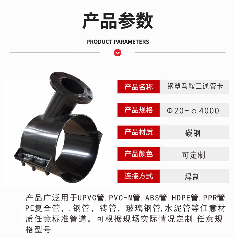 適用管道:PE管、PPR管、PVC管、球墨鑄鐵管、鋼管、水泥管等(提供管道外徑即可)