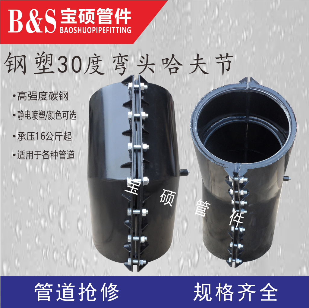 彎頭哈夫節用于管道彎頭部位出現砂眼、裂縫、斷裂的搶修。主要適用于鍍鋅管、鋼管、PE管、PVC管。